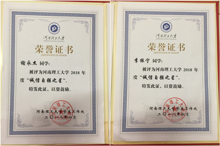 为弘扬诚信自强精神,鼓励受助学生自强不息、诚信还贷,近期,学校组织开展了2018年度“诚信自强之星”评选活动。我院2014级网络工程专业学生李振宁、谢永杰获得565net必赢最新版首页官网2018年度“诚信自强之星”称号。